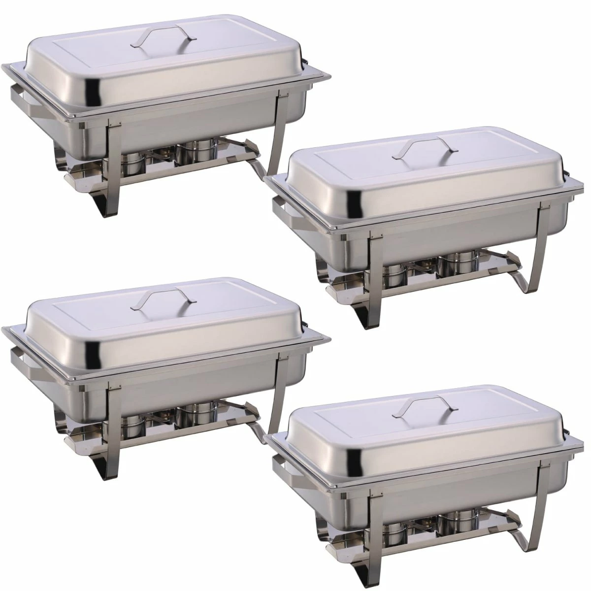 This set comes in 4 pcs. A commercial stainless steel 1/1 gastronorm sized professional chafer set with water pan, nine litre food pan, cover and two fuel holders.