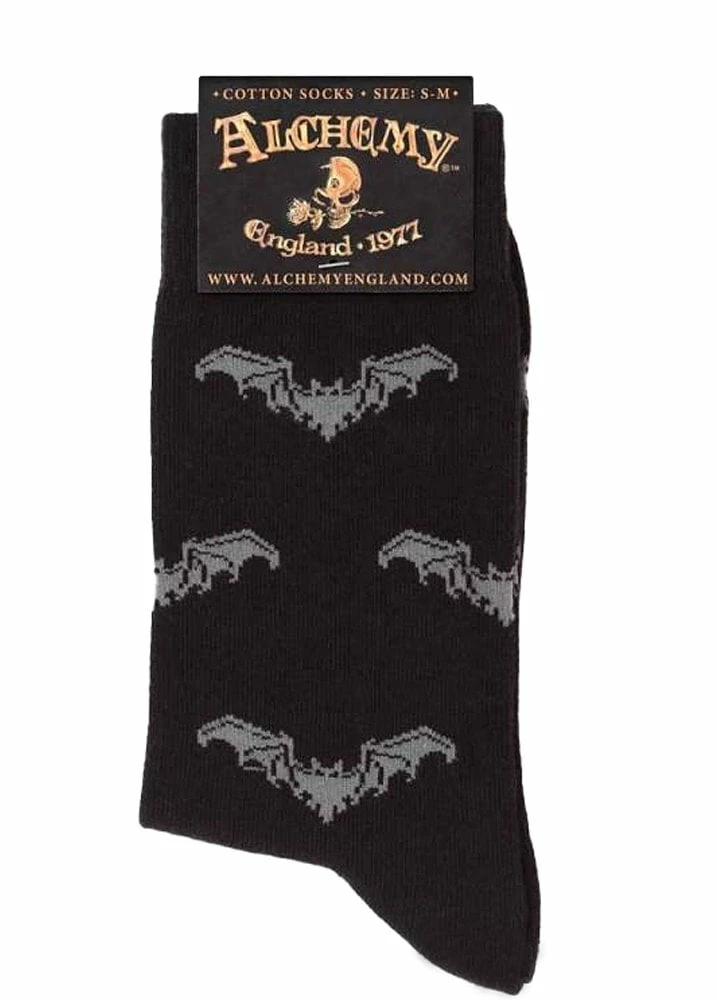 The Gothic Bat Socks from Alchemy Gothic are a pair of gothic ankle socks. The socks feature an all over bats design.