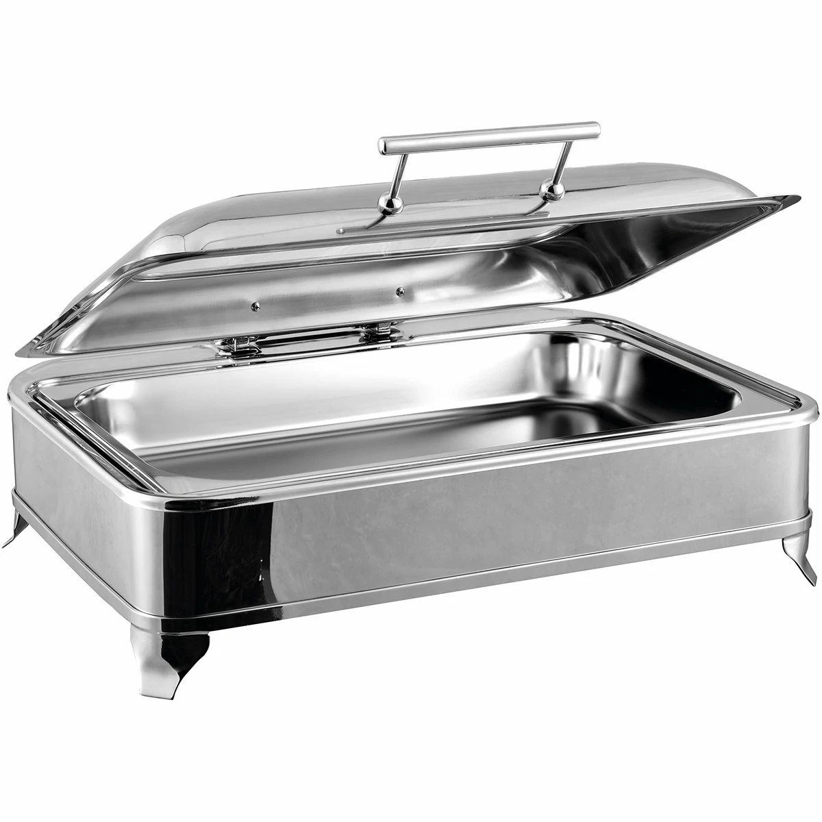 Attractive food presentation method, ideal for buffet use, featuring a top quality stainless steel construction with a glass section in the lid allowing the food to be displayed whilst covered. This 9 litre commercial chafer is safer to use than traditional catering chafers with no naked flames, the hydraulic lid opening and closing system also offers improved safety and easier use. This catering chafing dish operates by an internal electric heating plate.