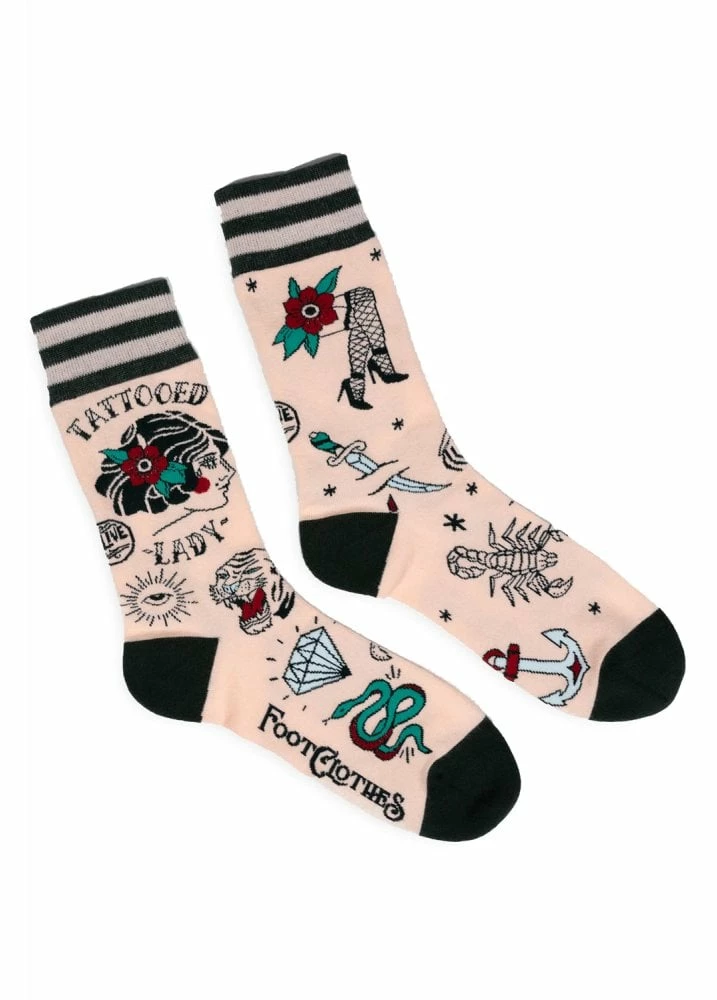 The Tattooed Lady Socks from Foot Clothes are a cute pair of rockabilly ankle socks. The pink ankle socks have a tattoo flash design with contrast heel and toe and striped top.