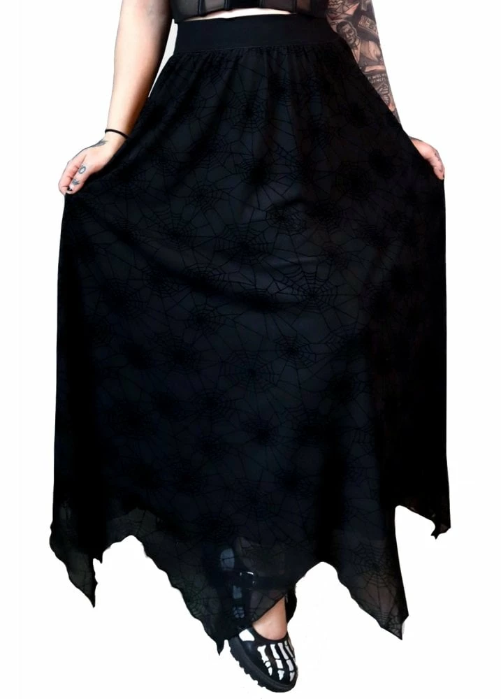 The Spider Web Mesh Maxi Skirt from Forest Ink is a lined maxi length skirt. The gothic skirt has a spiderweb mesh top layer, jagged hem and elasticated waistband.