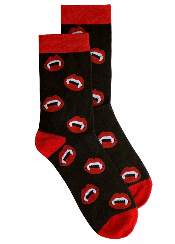 The Bite Me Socks from Foxblood are a comfy pair of athletic socks. The socks features a red trim and vampire lips and fangs design.