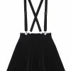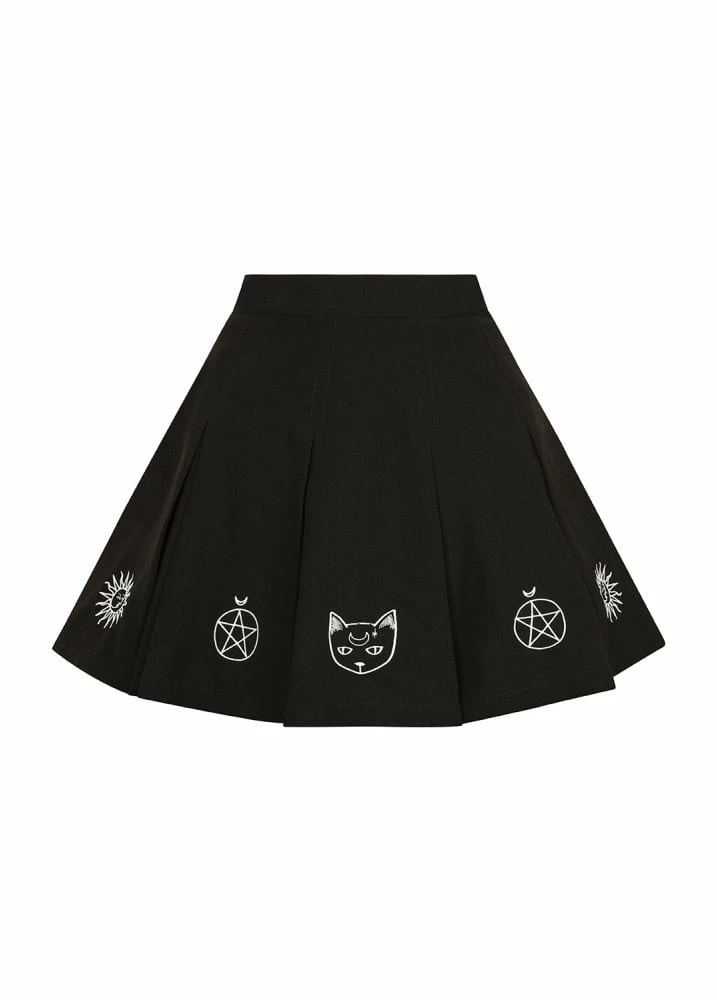 Hell Bunny’s Dawn Mini Skirt is a black skater skirt with zip back. The gothic pleated skirt has embroidered witchy symbols around the hem.