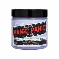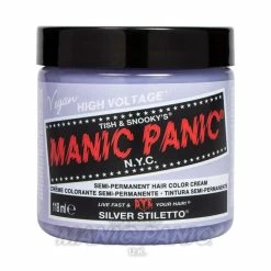 The Silver Stiletto toner from Manic Panic’s Classic Cream range is designed to clean up blonde tones in bleached and lightened hair. When applied to a very pale, pre-lightened blonde hair, this toner creates a stunning silver colour and helps to neutralise brassy tones. Lasts for 2-4 weeks, and no developer needed!