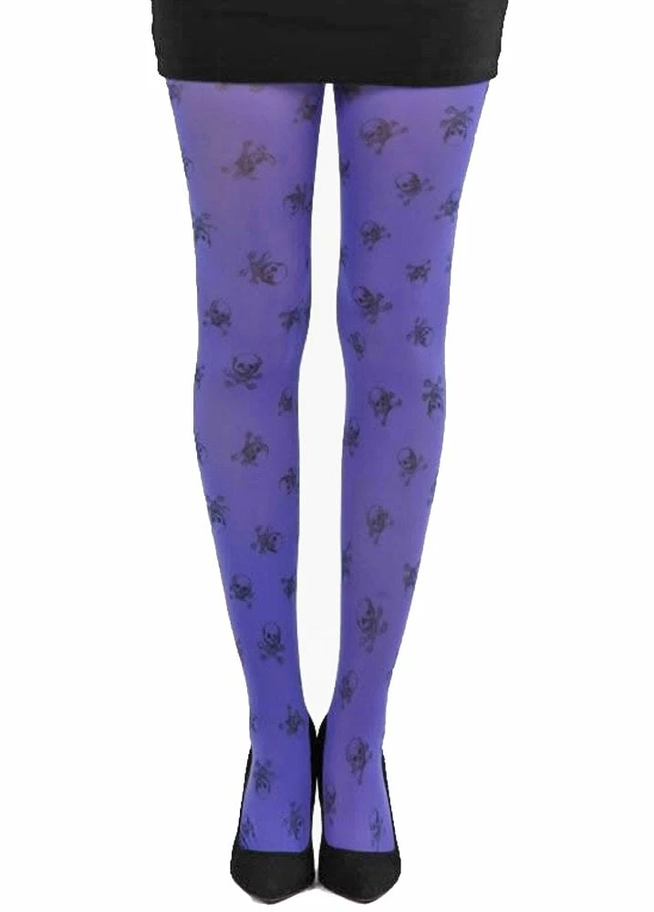 The Skulls Printed Purple Tights from Pamela Mann are a pair of opaque purple tights. The tights feature a black skull and crossbones design and look great under dresses, skirts and shorts.