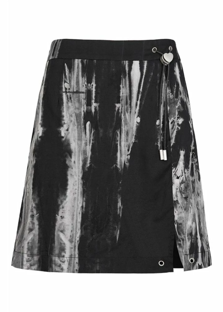 Punk Rave’s Spray Paint Skirt is a black skirt with white paint effect print. The alternative mini skirt has a side drawstring at the waist with heart pull.